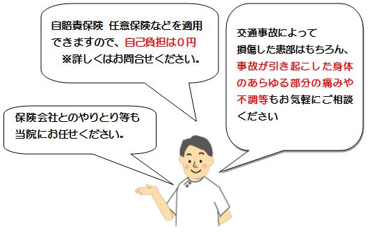 交通事故による治療は、自賠責保険適用となりますので患者さまの負担はありません。